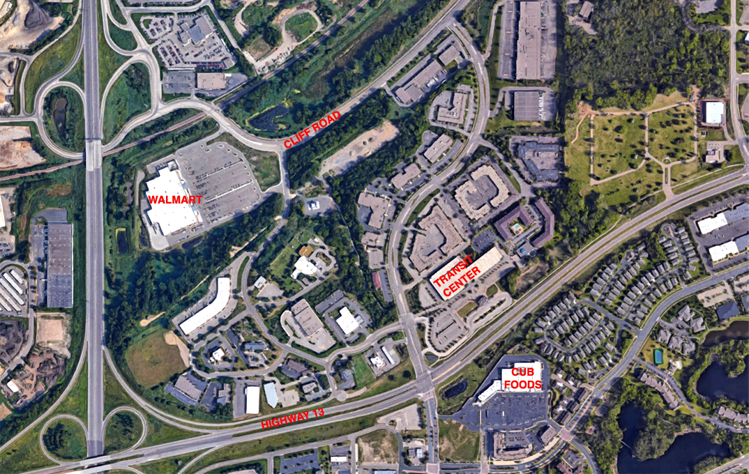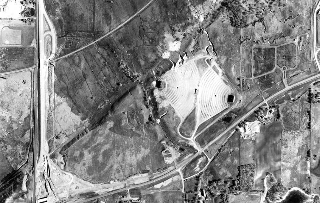 Broadly speaking you are looking down at the northeast quadrant of today's Interstate 35W and Highway 13 in north Burnsville. Notice that the future freeway was under construction in 1960 but Lyndale Avenue still carried traffic. The dual arcs of parking spaces are visible just right of center, as are shadows from each of the two screens.